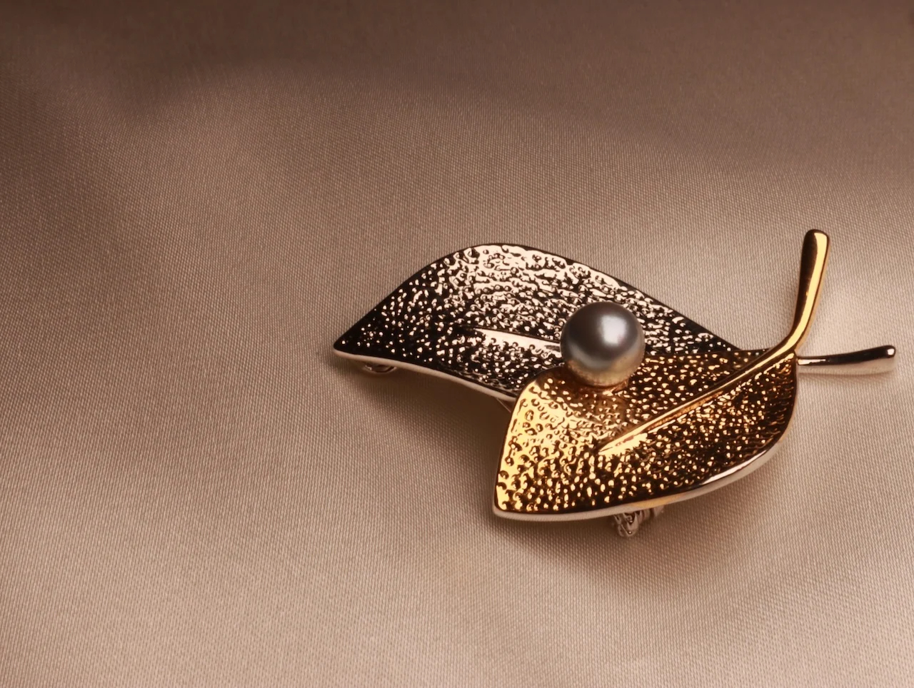 • Exquisite Handcrafted Real Round Pearls Brooch with Silver and Gold Leaf Design