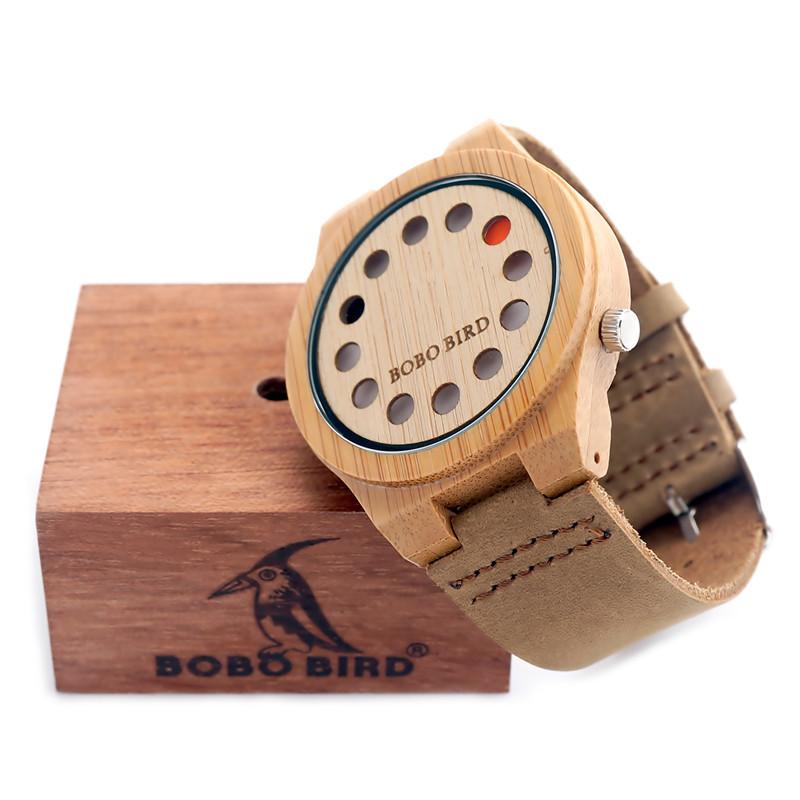 Our BOBO BIRD 12 Hole Bamboo Wood Watch With White Real Leather Straps is a beautiful fashion watch with a sleek and classic design. With its white dial and 12-hole wooden case, this watch will not only be admired by all who see it, but will also look great paired with any outfit!