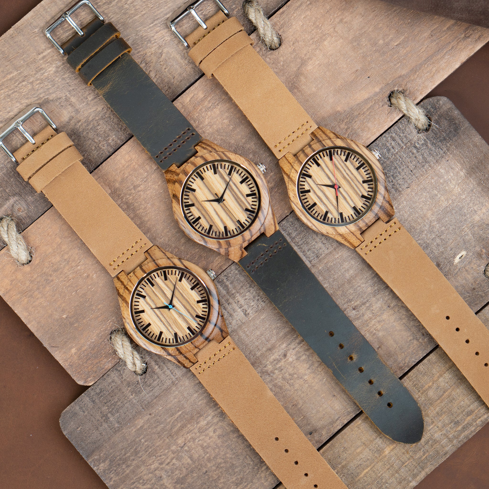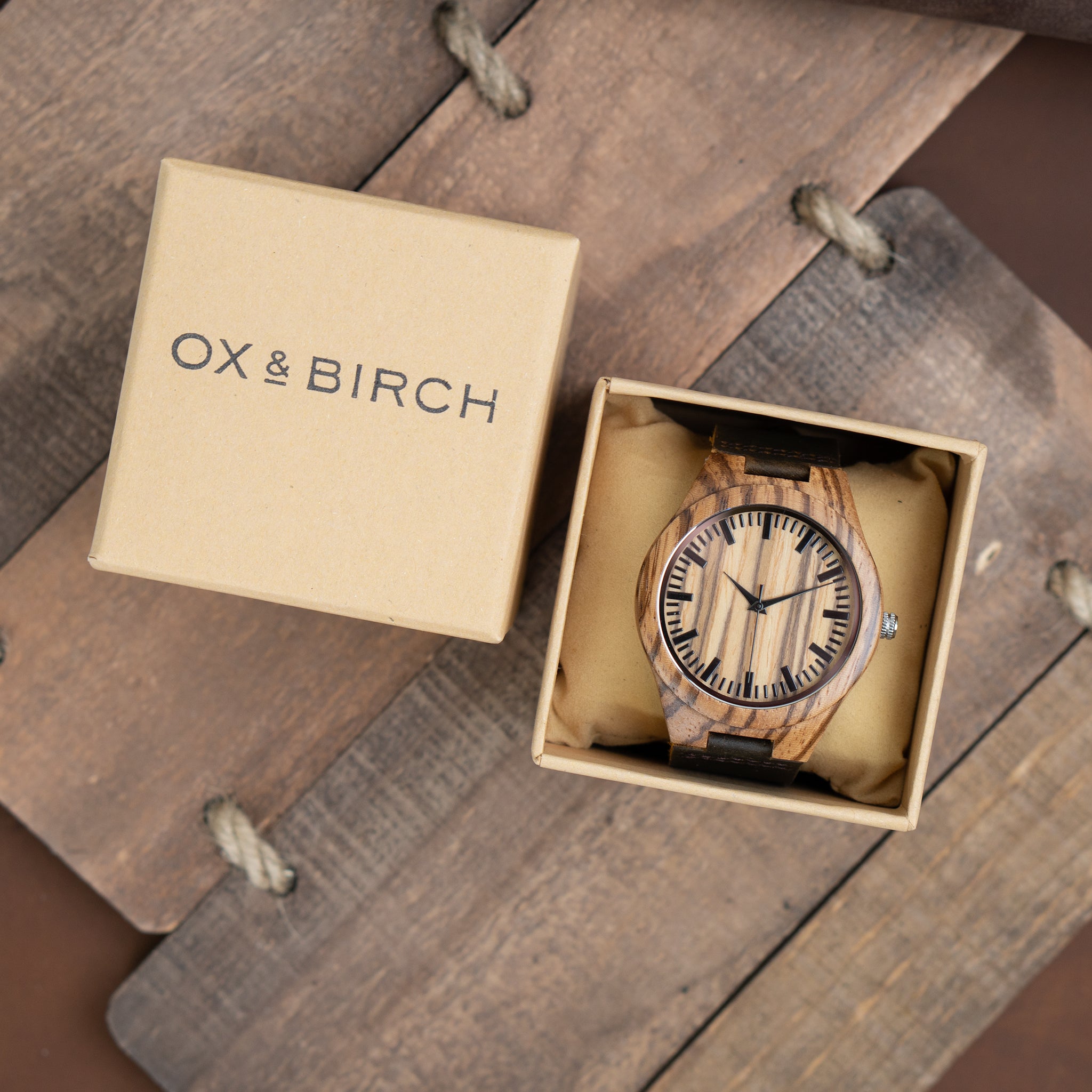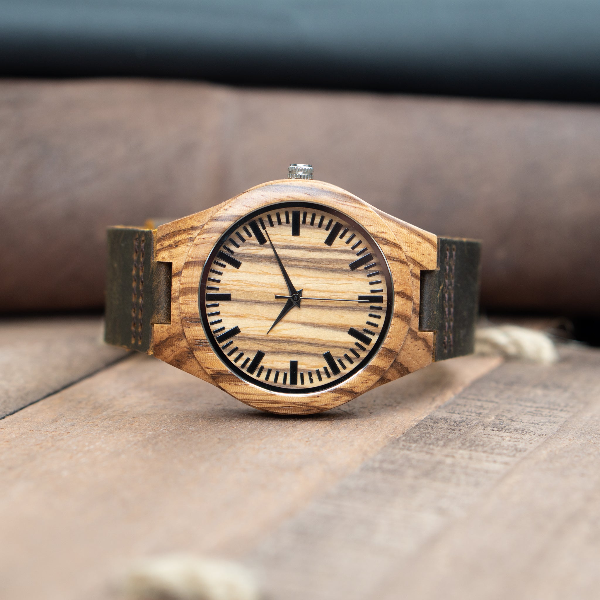 Forest is a wooden watch made from natural zebra wood and has a brown genuine leather band that is soft and comfortable.