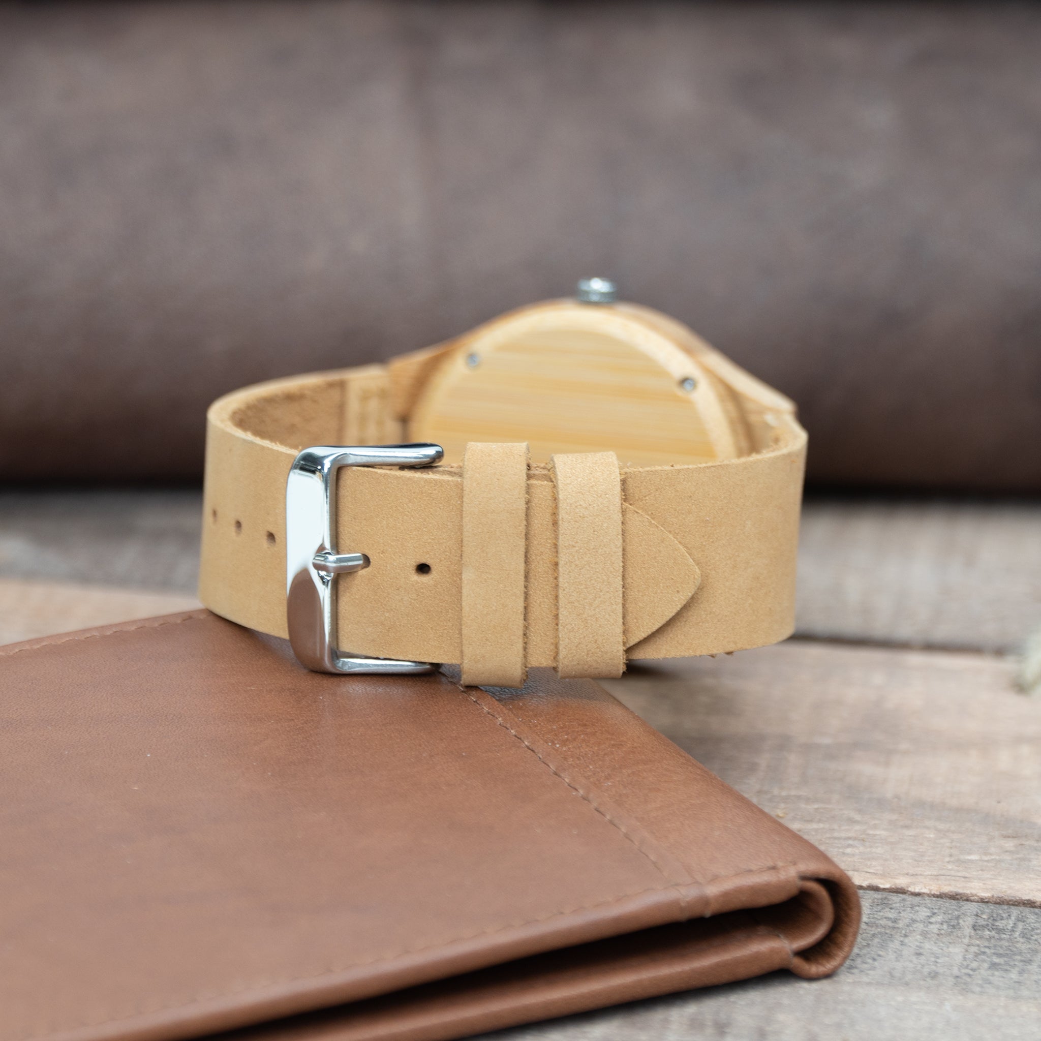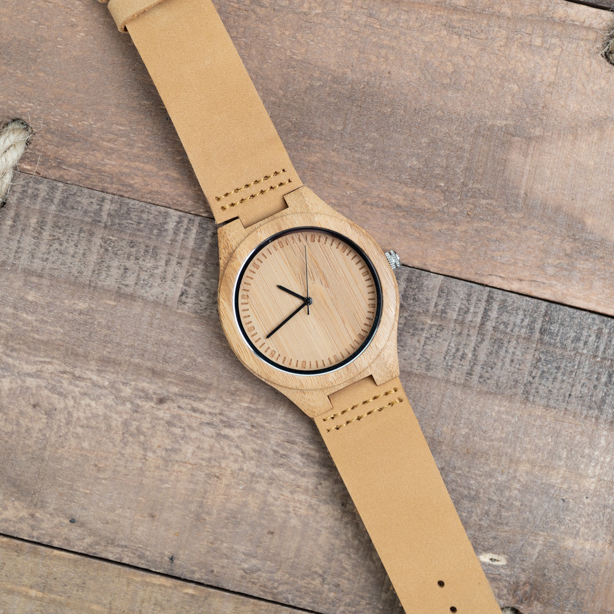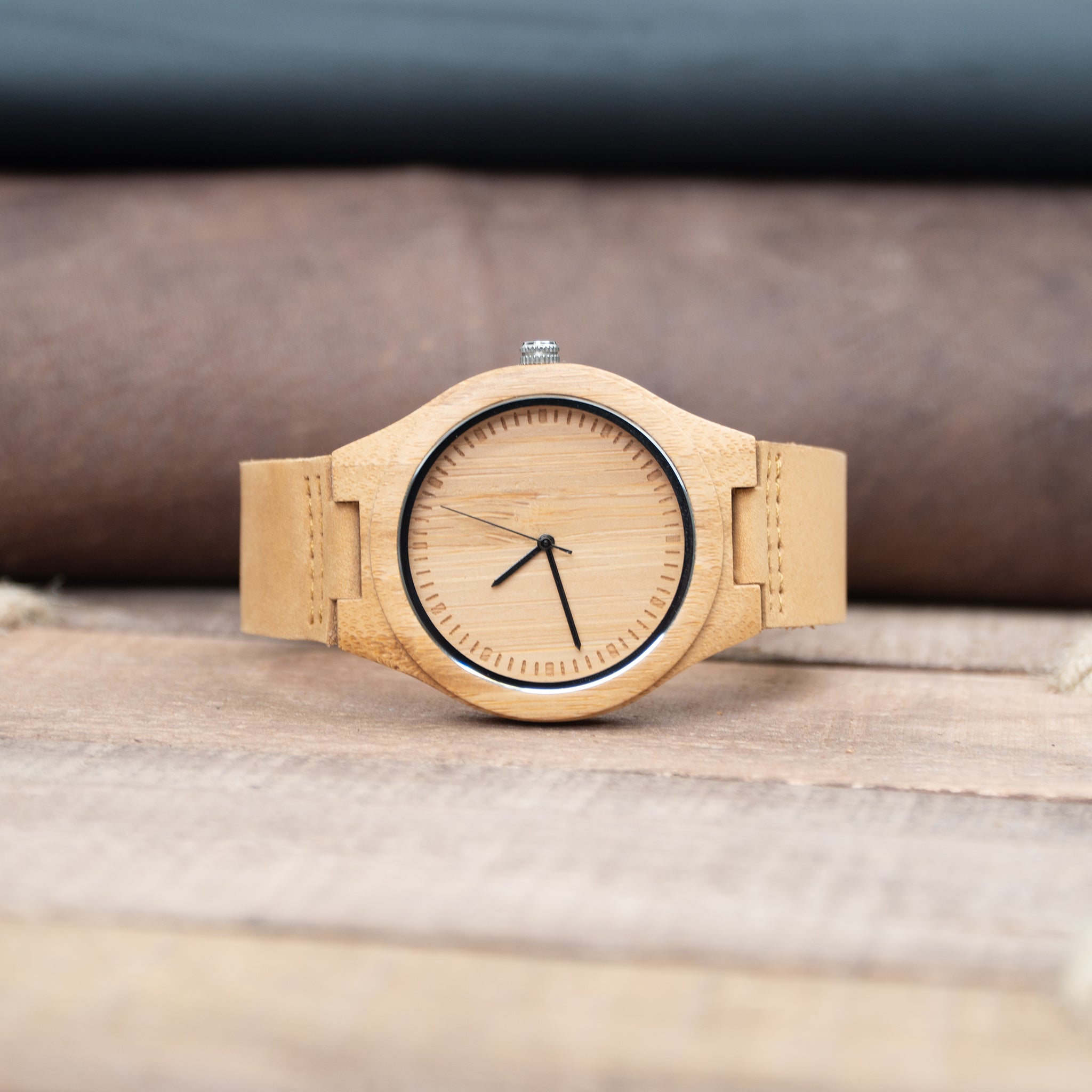 Bamboo Wood watch made from natural wood and has a matching genuine leather band that is soft and comfortable.