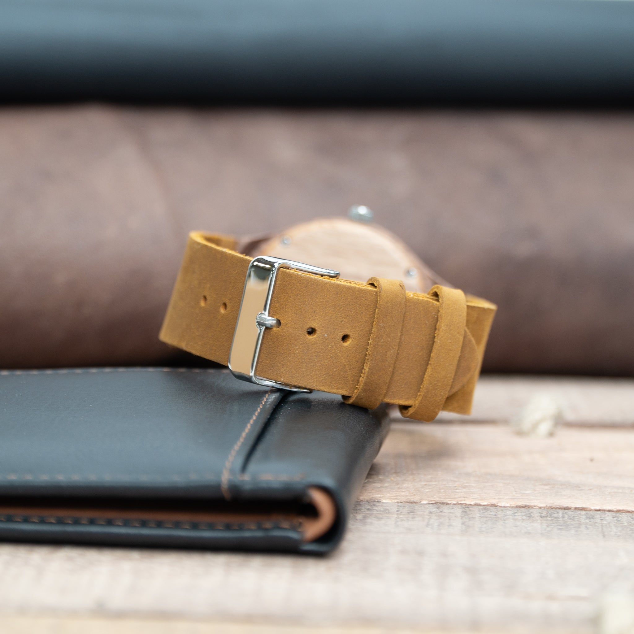 Wooden watch made from natural wood and has a genuine leather band that is soft and comfortable.