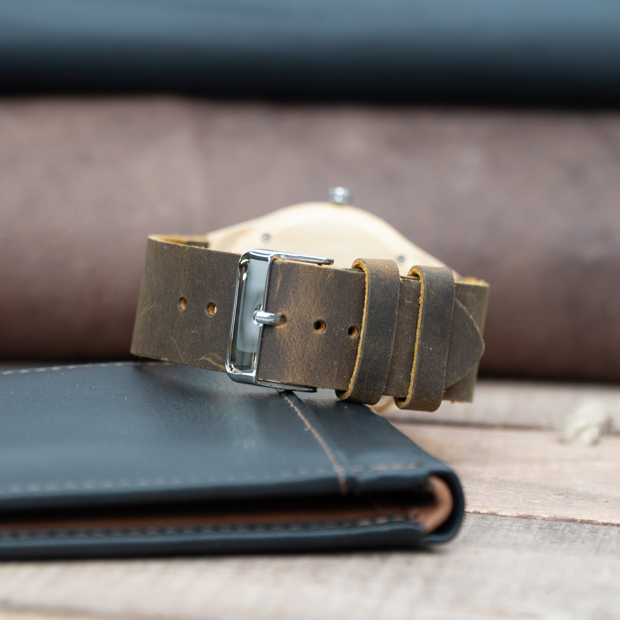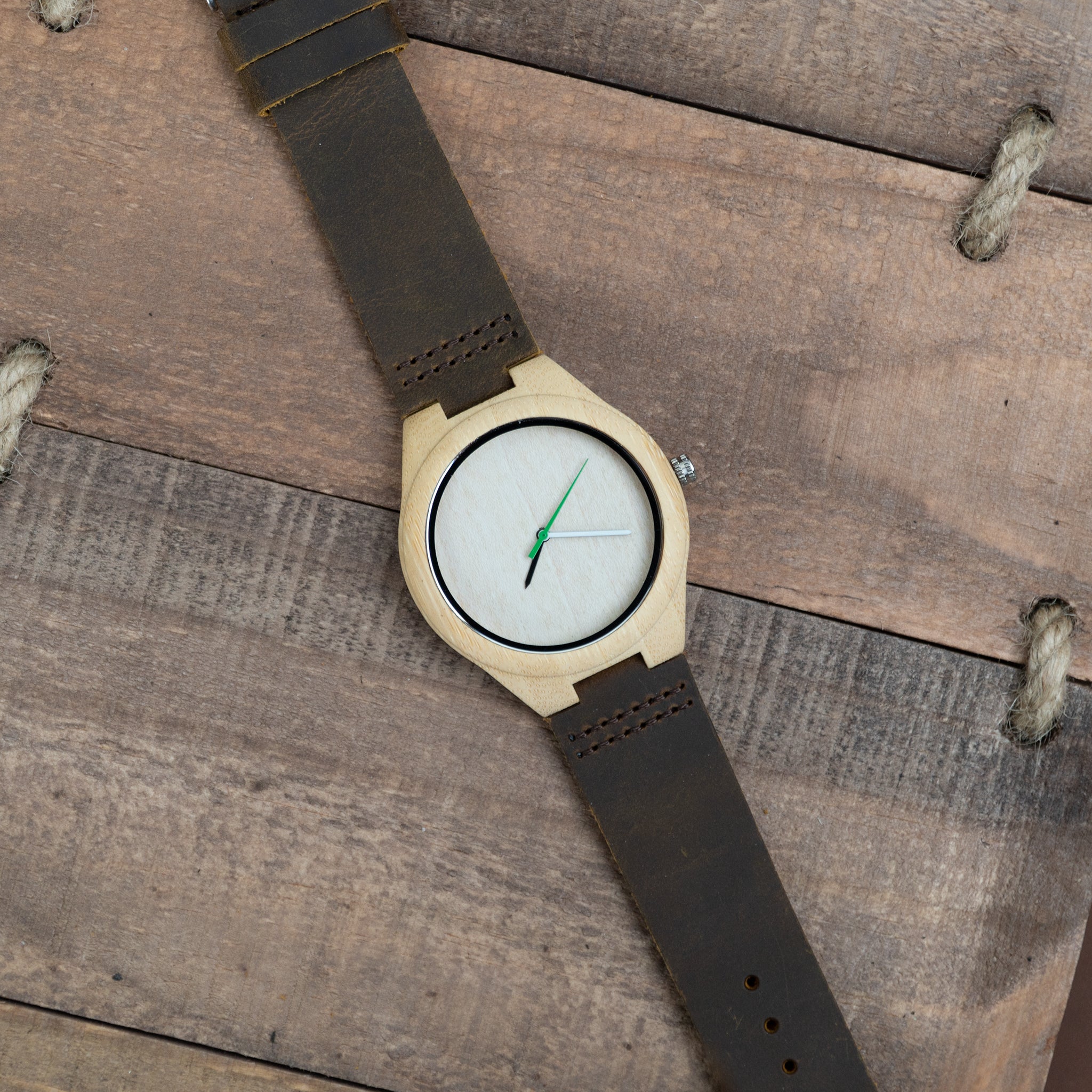 Bamboo Wood watch made from natural wood and has a dark brown genuine leather band that is soft and comfortable. This minimalist watch is accented with a green second hand that complements the black and white hour and minute hands.